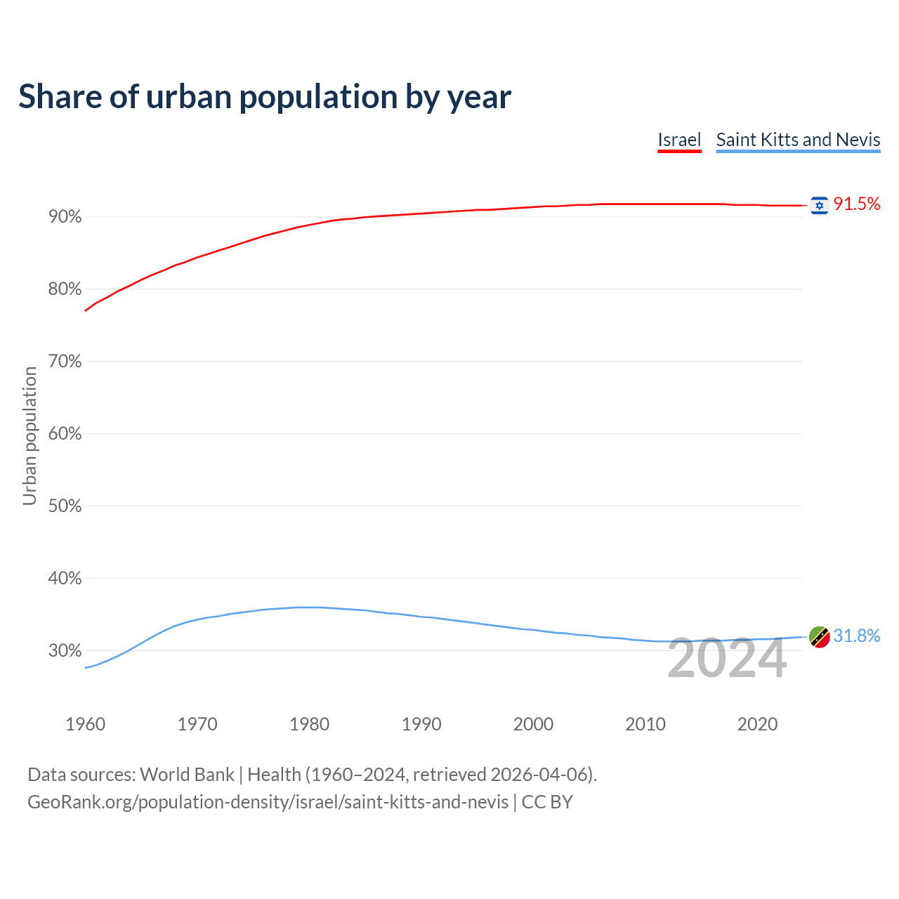 From 2004 to 2024, the share of urban population changed from 91.6% to 91.5% in Israel and from 32.1% to 31.8% in Saint Kitts and Nevis.