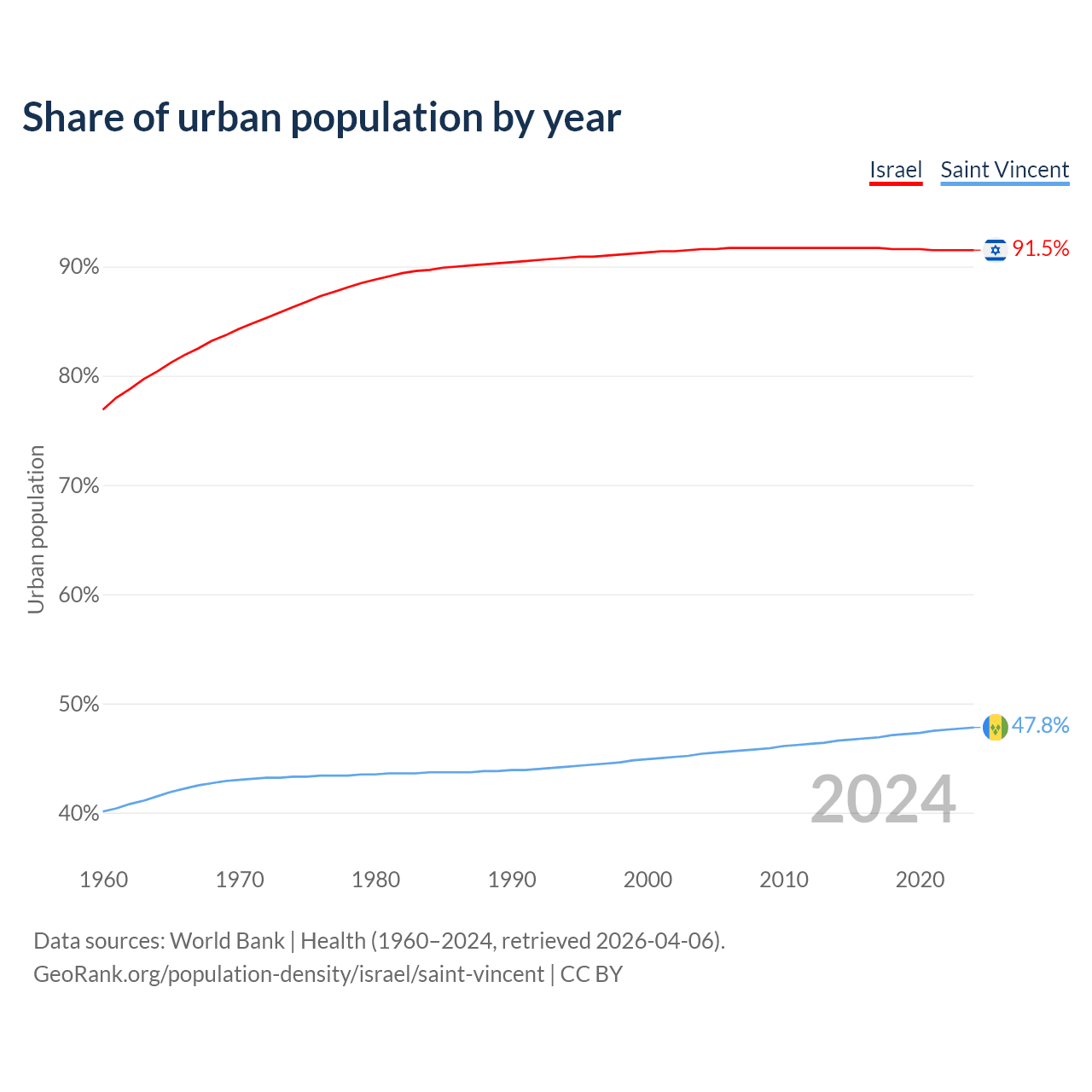 From 2004 to 2024, the share of urban population changed from 91.6% to 91.5% in Israel and from 45.4% to 47.8% in Saint Vincent.