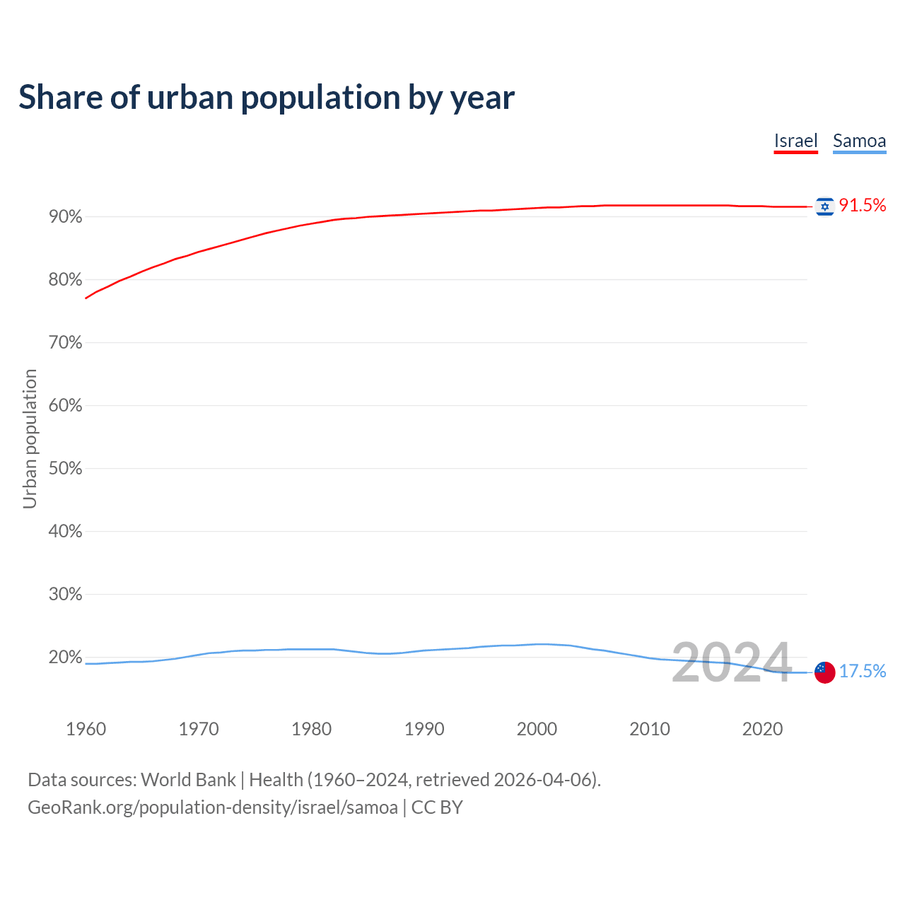 From 2004 to 2024, the share of urban population changed from 91.6% to 91.5% in Israel and from 21.5% to 17.5% in Samoa.