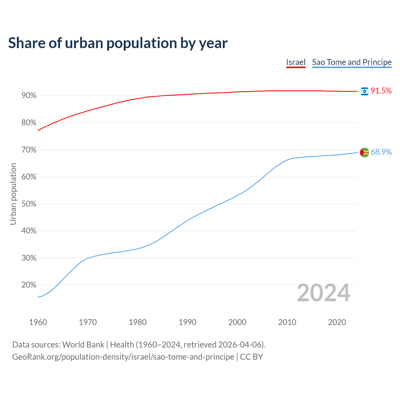 From 2004 to 2024, the share of urban population changed from 91.6% to 91.5% in Israel and from 57.9% to 68.9% in Sao Tome and Principe.