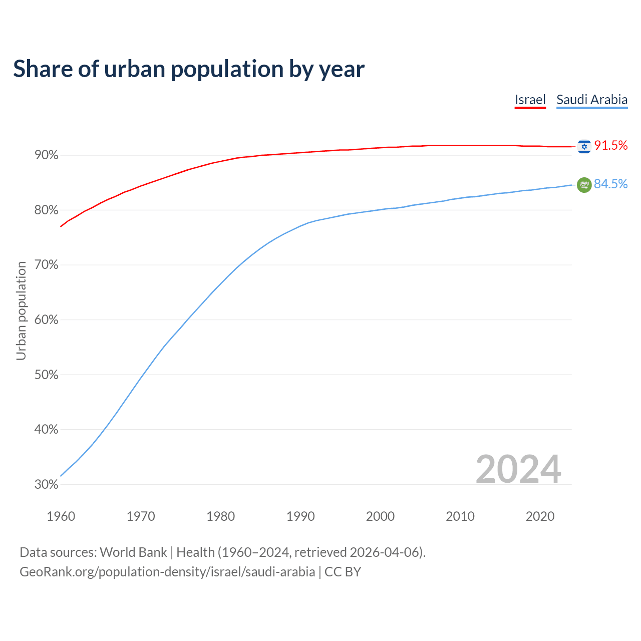 From 2004 to 2024, the share of urban population changed from 91.6% to 91.5% in Israel and from 80.8% to 84.5% in Saudi Arabia.
