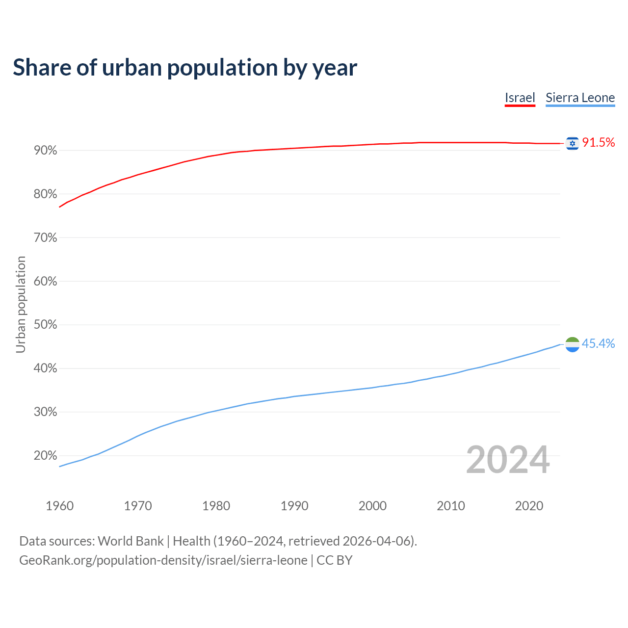 From 2004 to 2024, the share of urban population changed from 91.6% to 91.5% in Israel and from 36.5% to 45.4% in Sierra Leone.