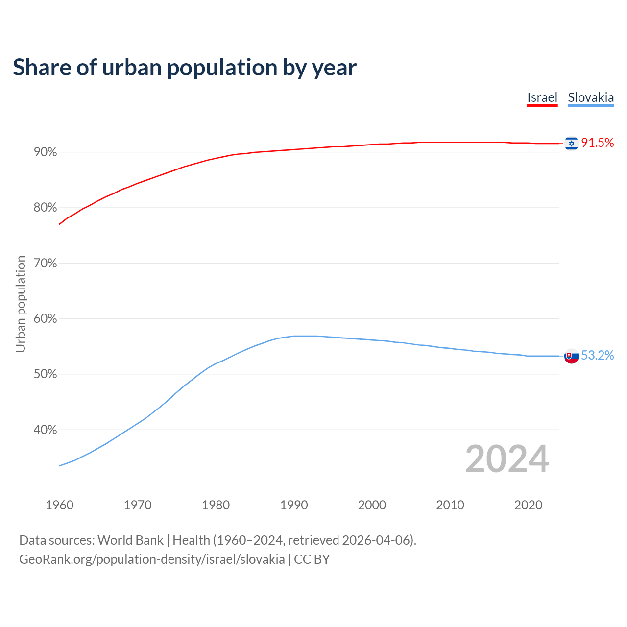 From 2004 to 2024, the share of urban population changed from 91.6% to 91.5% in Israel and from 55.6% to 53.2% in Slovakia.