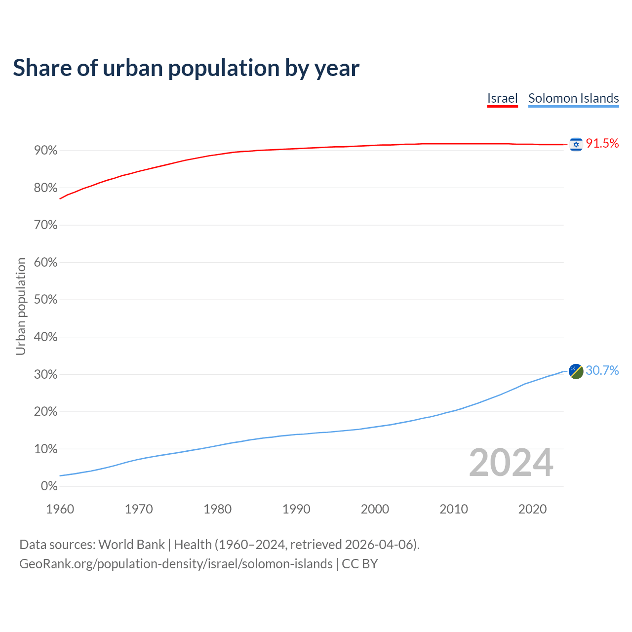 From 2004 to 2024, the share of urban population changed from 91.6% to 91.5% in Israel and from 17.2% to 30.7% in the Solomon Islands.