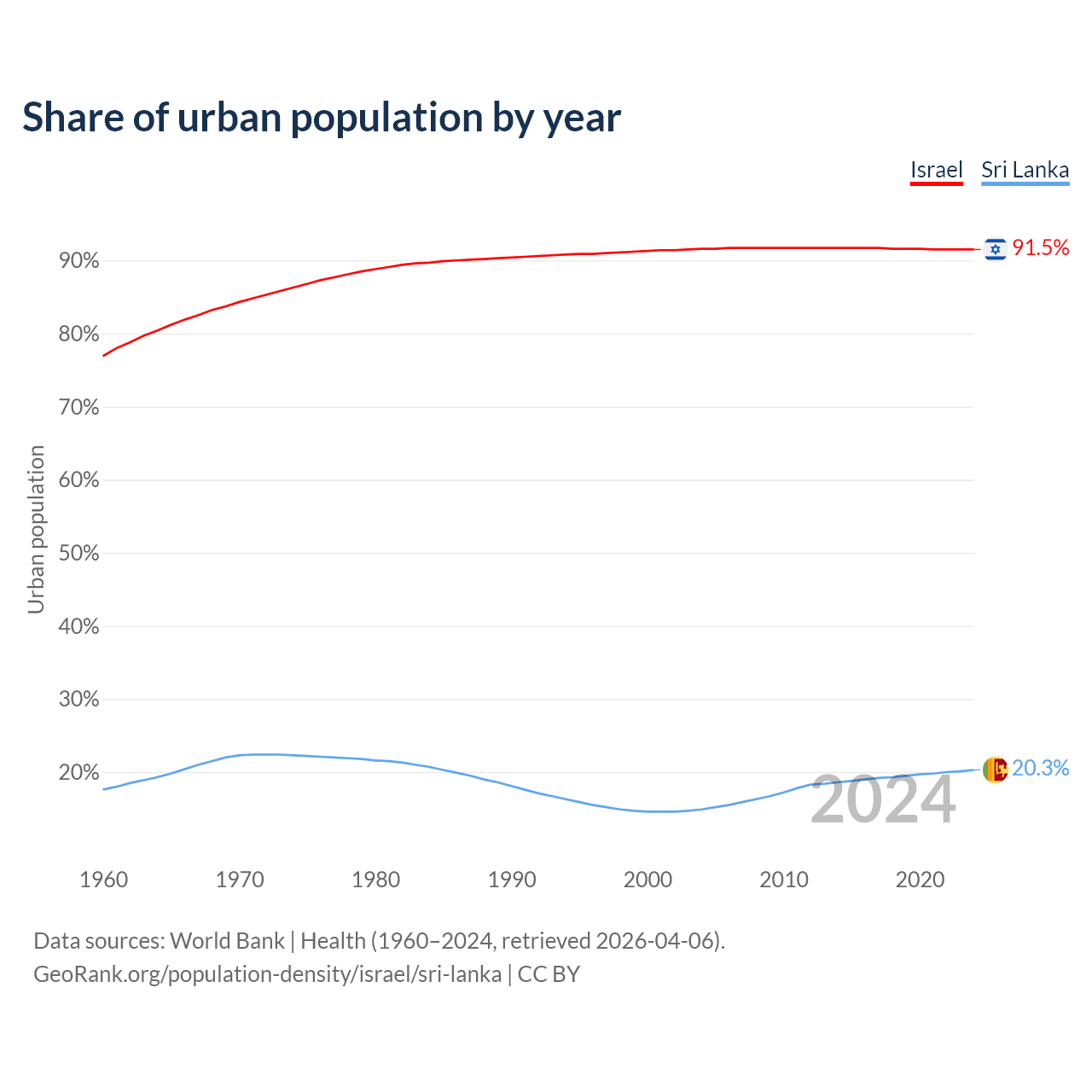 From 2004 to 2024, the share of urban population changed from 91.6% to 91.5% in Israel and from 14.9% to 20.3% in Sri Lanka.