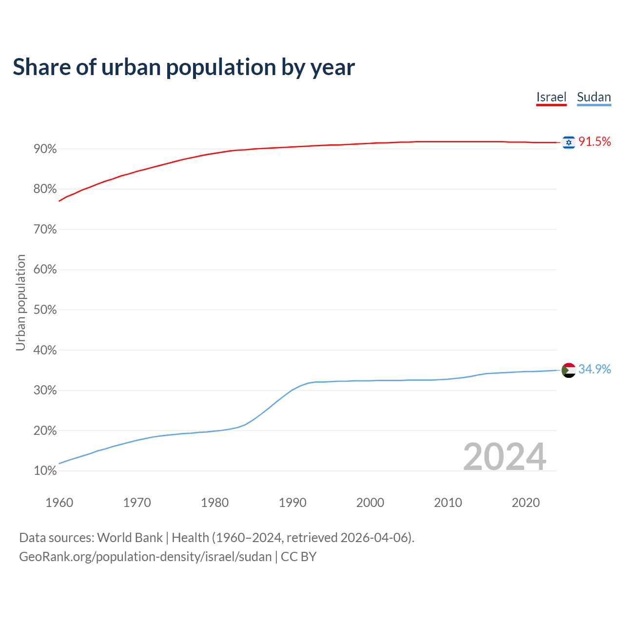 From 2004 to 2024, the share of urban population changed from 91.6% to 91.5% in Israel and from 32.4% to 34.9% in Sudan.