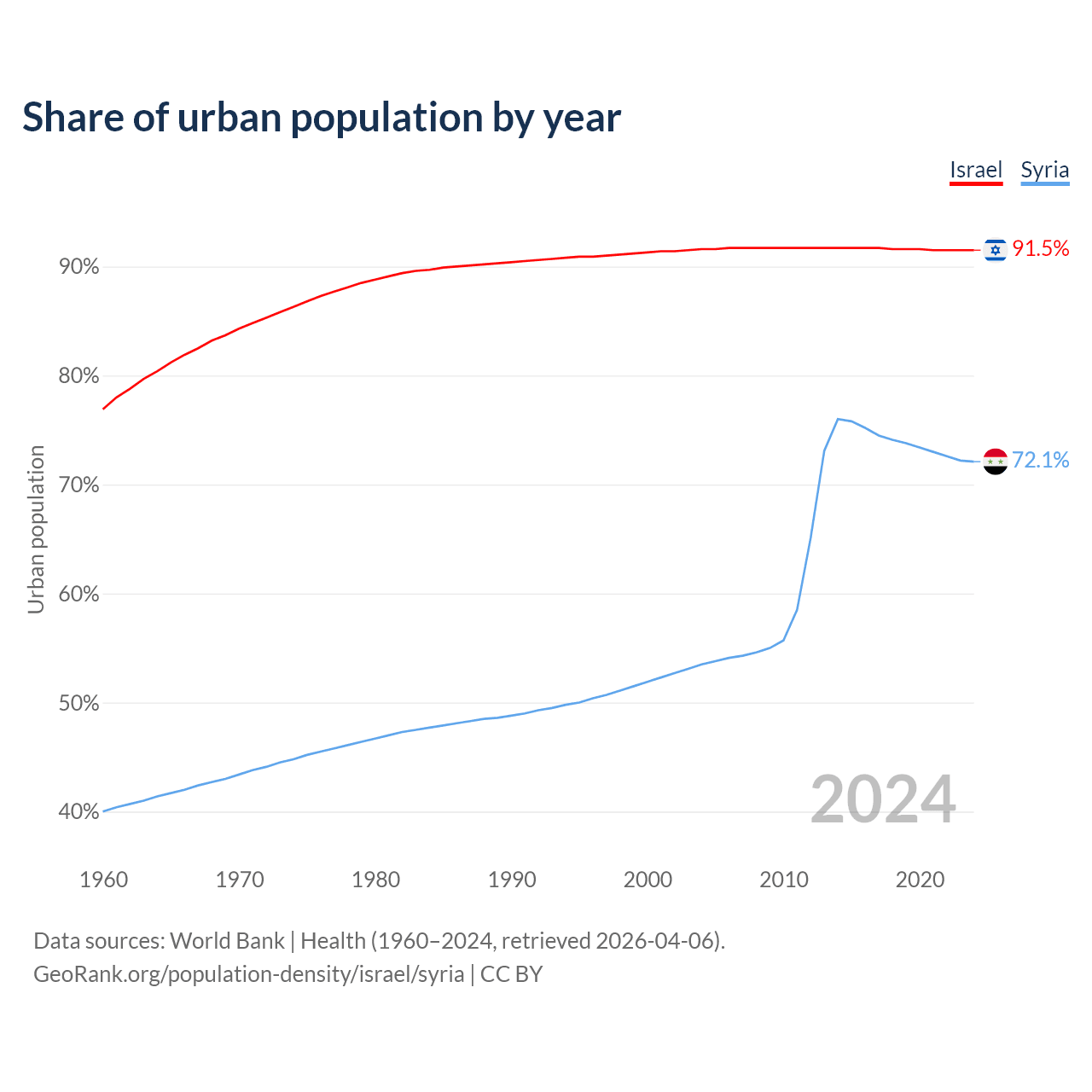 From 2004 to 2024, the share of urban population changed from 91.6% to 91.5% in Israel and from 53.5% to 72.1% in Syria.