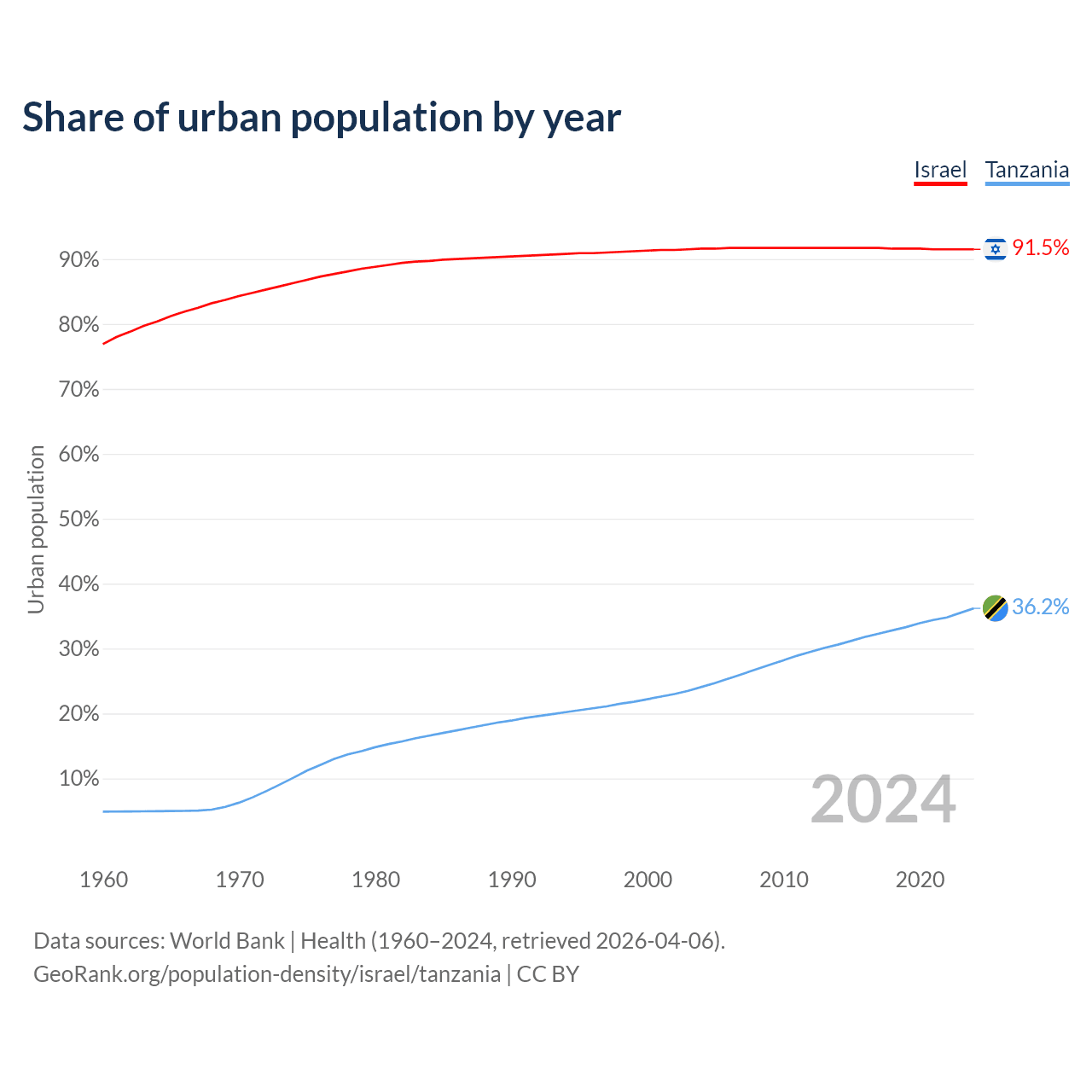 From 2004 to 2024, the share of urban population changed from 91.6% to 91.5% in Israel and from 24.1% to 36.2% in Tanzania.