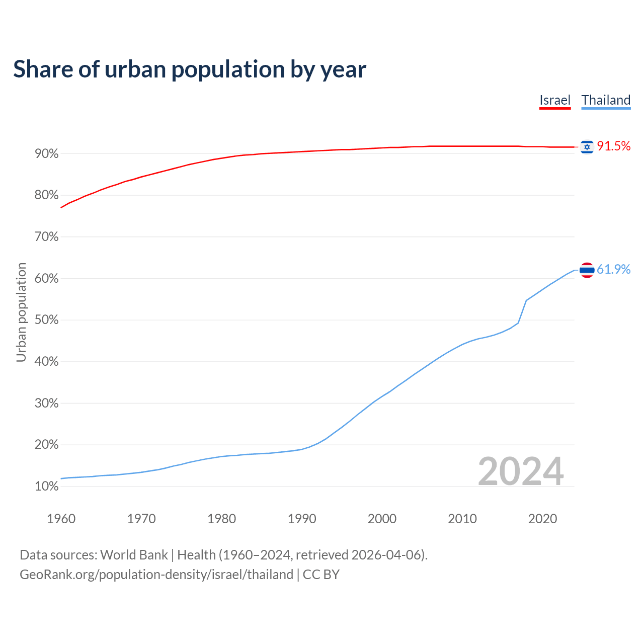 From 2004 to 2024, the share of urban population changed from 91.6% to 91.5% in Israel and from 36.8% to 61.9% in Thailand.