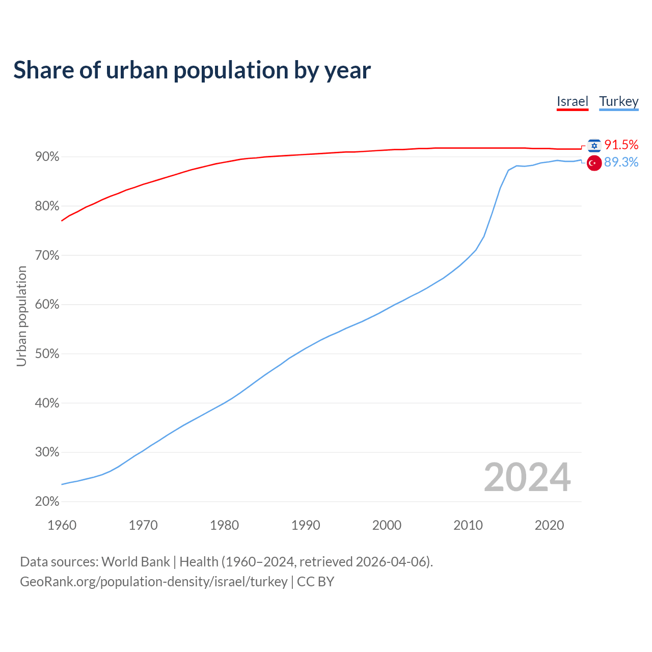From 2004 to 2024, the share of urban population changed from 91.6% to 91.5% in Israel and from 62.4% to 89.3% in Turkey.