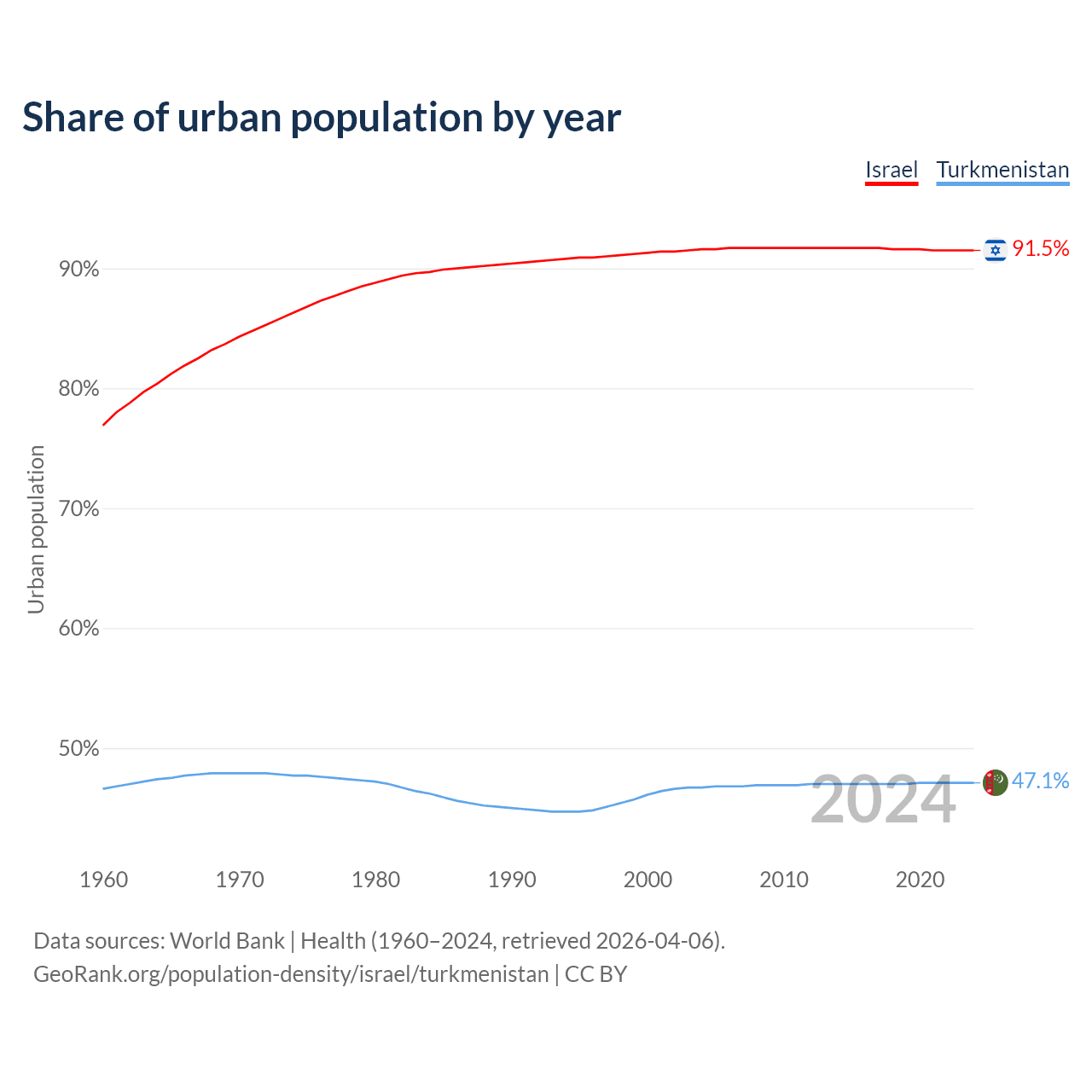 From 2004 to 2024, the share of urban population changed from 91.6% to 91.5% in Israel and from 46.7% to 47.1% in Turkmenistan.