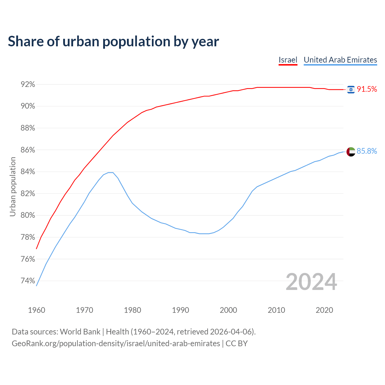 From 2004 to 2024, the share of urban population changed from 91.6% to 91.5% in Israel and from 81.5% to 85.8% in the United Arab Emirates.