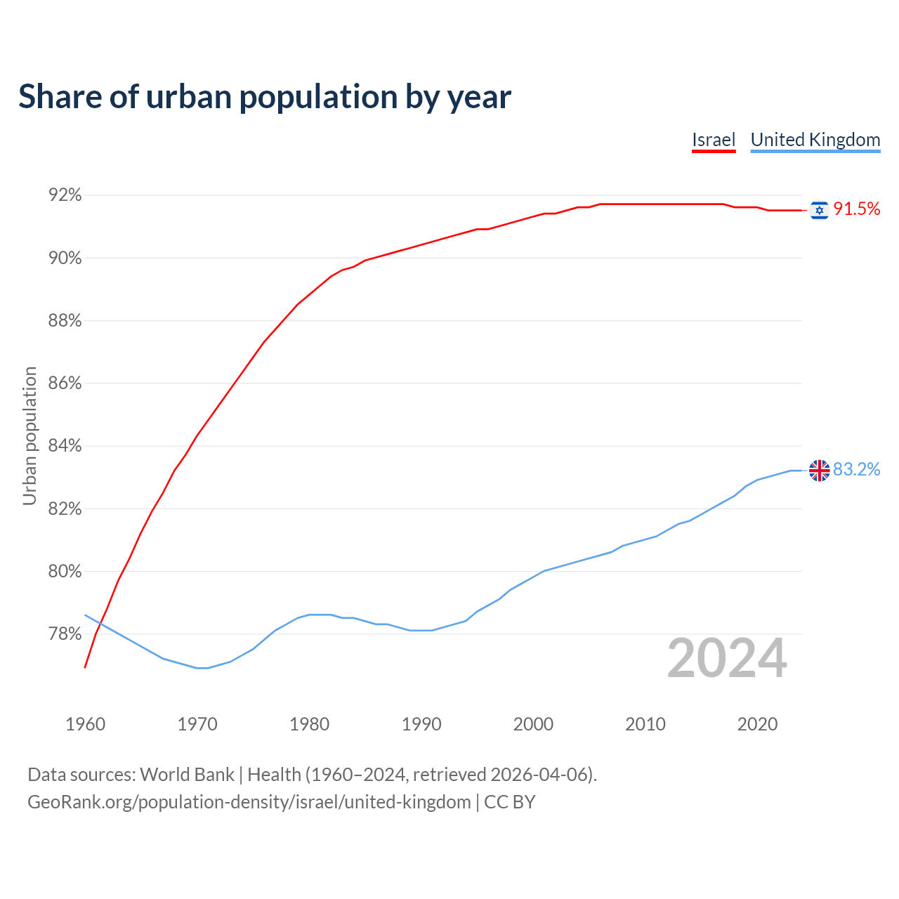 From 2004 to 2024, the share of urban population changed from 91.6% to 91.5% in Israel and from 80.3% to 83.2% in the United Kingdom.