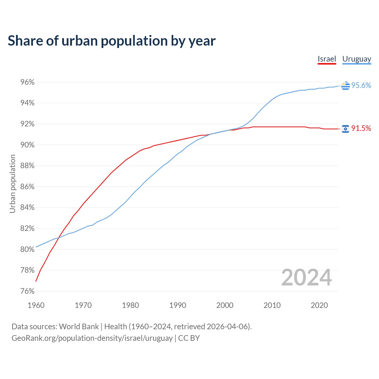 From 2004 to 2024, the share of urban population changed from 91.6% to 91.5% in Israel and from 91.8% to 95.6% in Uruguay.