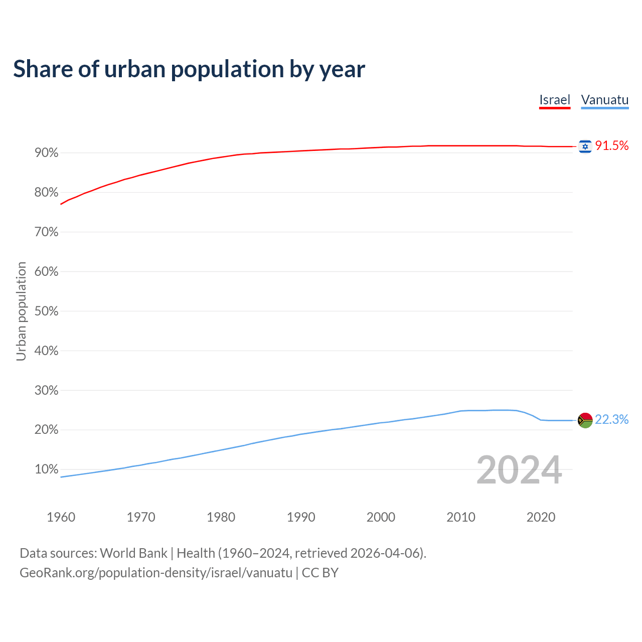 From 2004 to 2024, the share of urban population changed from 91.6% to 91.5% in Israel and from 22.7% to 22.3% in Vanuatu.