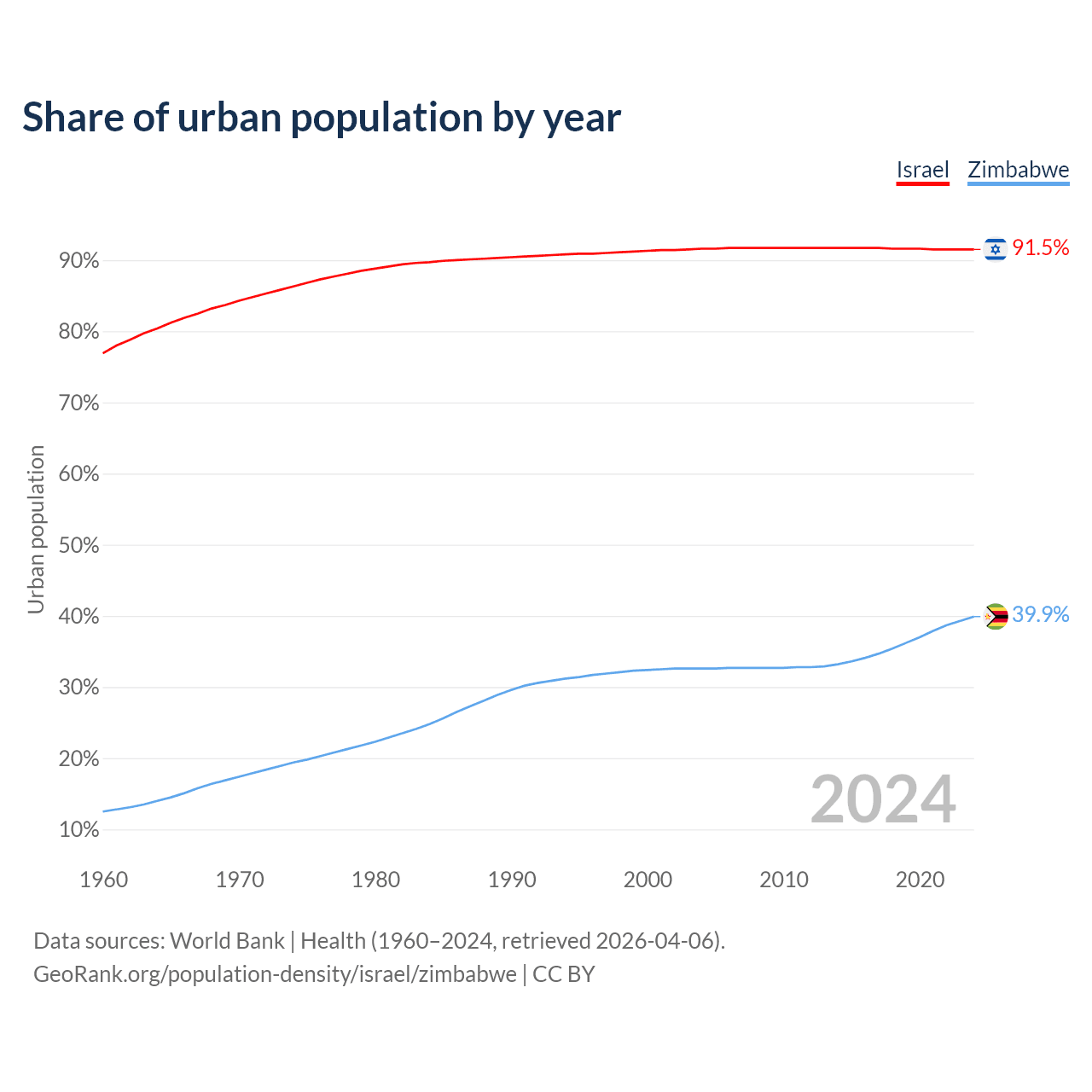 From 2004 to 2024, the share of urban population changed from 91.6% to 91.5% in Israel and from 32.6% to 39.9% in Zimbabwe.