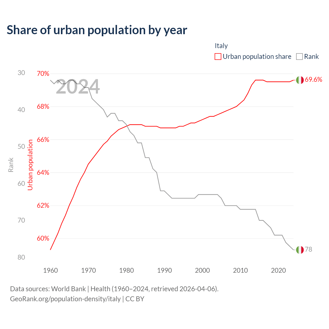 This chart shows the share of urban population in Italy from 1960 to 2024: 59.3% lived in urban areas in 1960, 67.2% in 2000, and 69.6% in 2024.