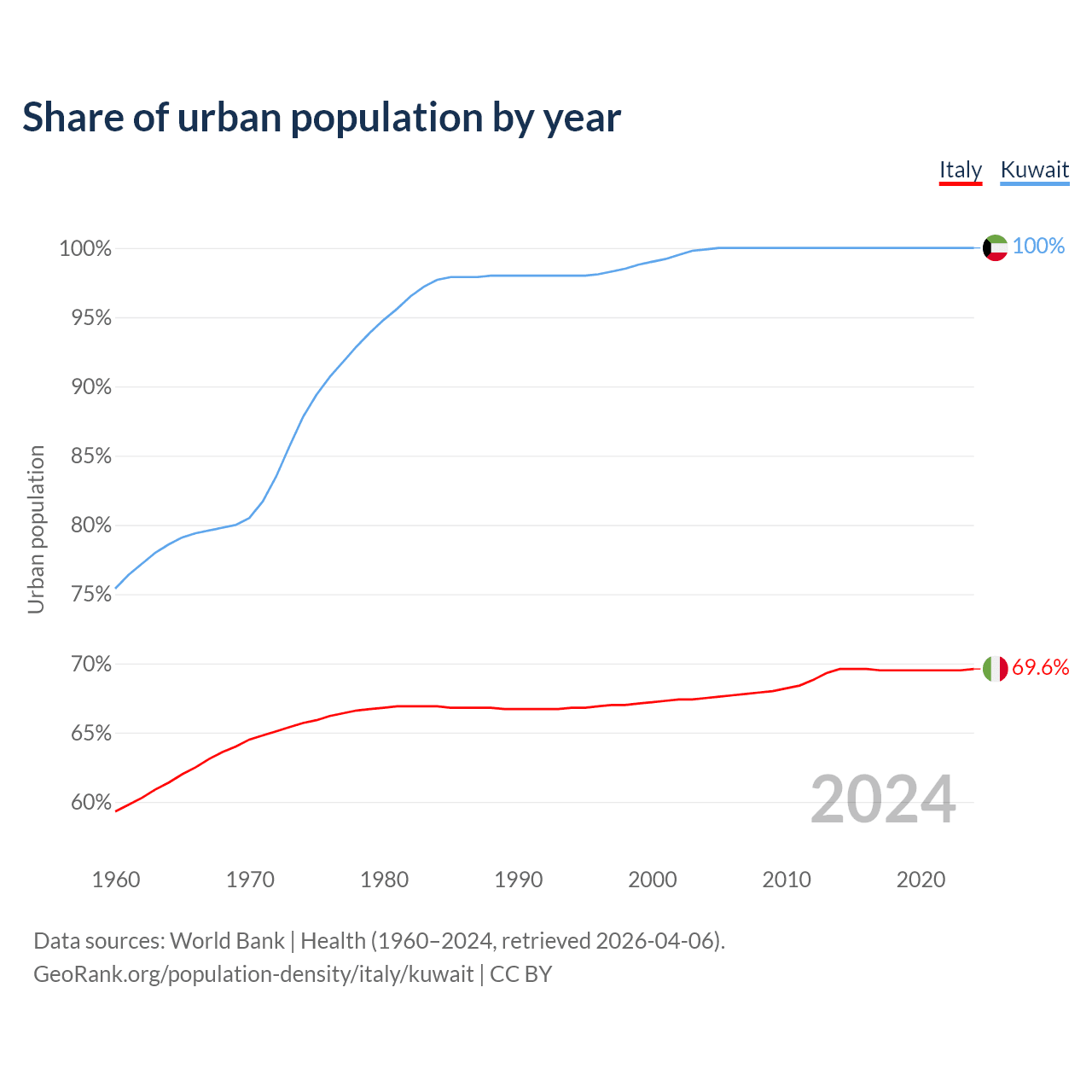From 2004 to 2024, the share of urban population changed from 67.5% to 69.6% in Italy and from 99.9% to 100% in Kuwait.