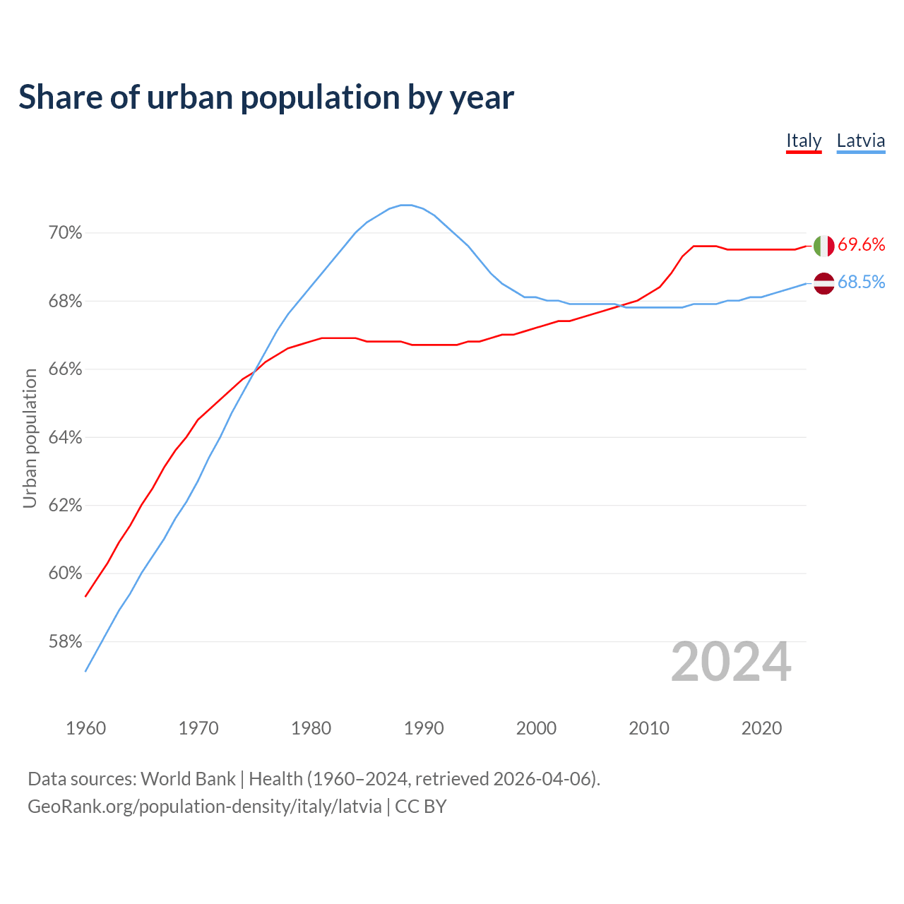 From 2004 to 2024, the share of urban population changed from 67.5% to 69.6% in Italy and from 67.9% to 68.5% in Latvia.