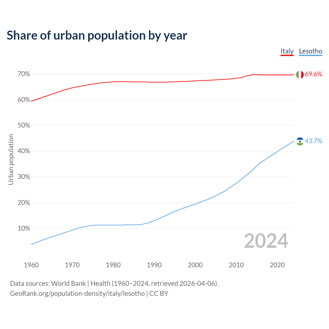From 2004 to 2024, the share of urban population changed from 67.5% to 69.6% in Italy and from 21.8% to 43.7% in Lesotho.