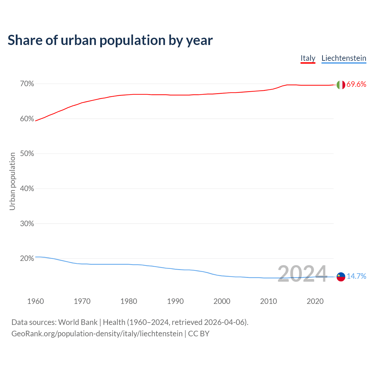 From 2004 to 2024, the share of urban population changed from 67.5% to 69.6% in Italy and from 14.7% to 14.7% in Liechtenstein.