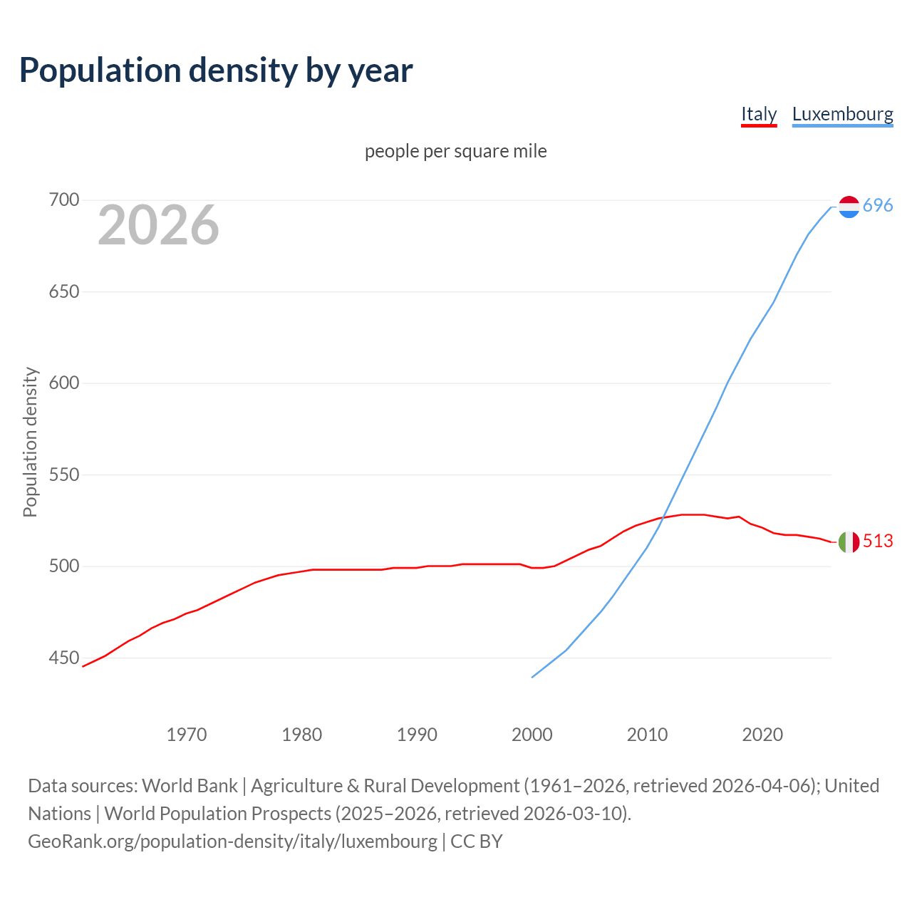 From 2006 to 2026, population density in Italy increased by 0.28%, compared to a 46.4% growth in Luxembourg.