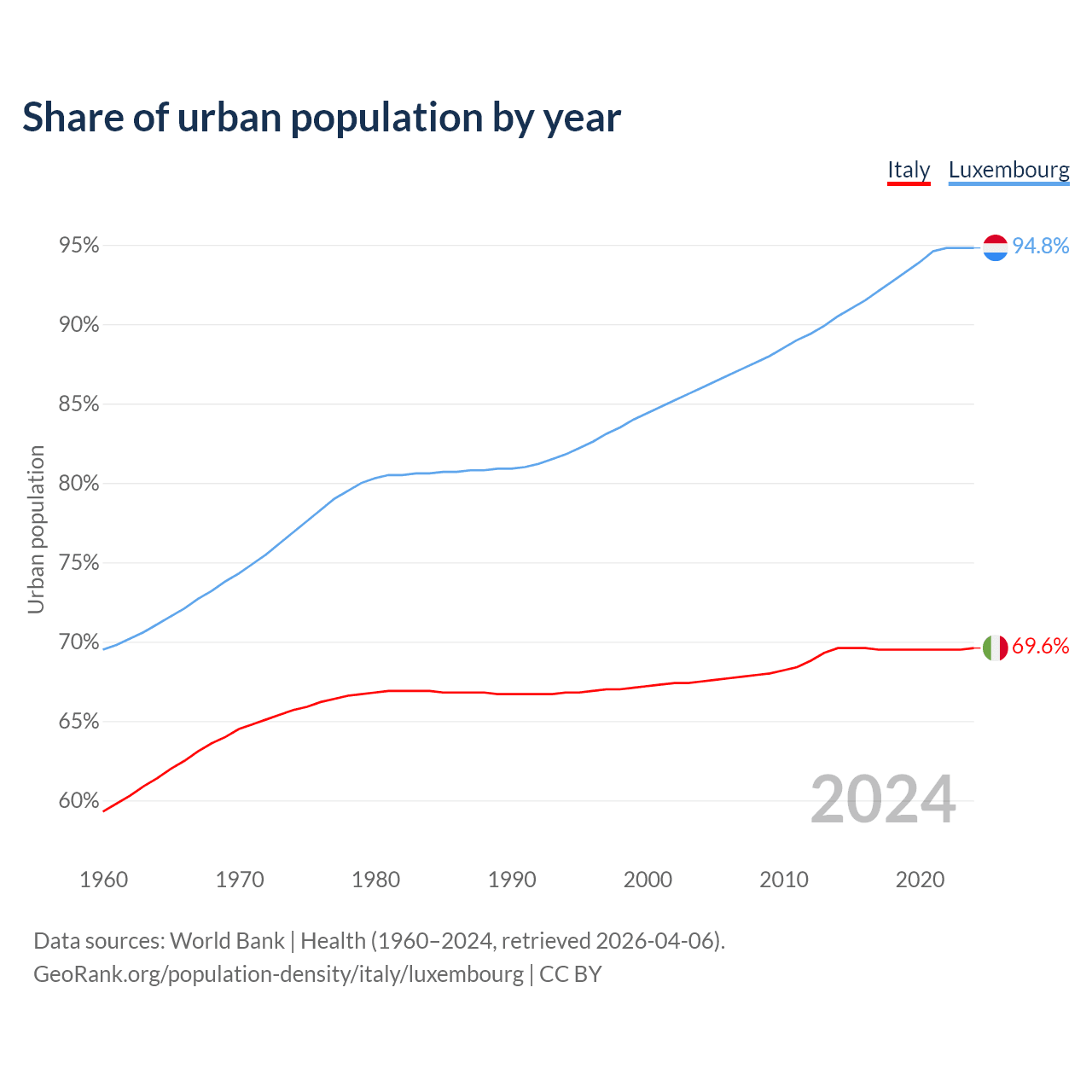 From 2004 to 2024, the share of urban population changed from 67.5% to 69.6% in Italy and from 86% to 94.8% in Luxembourg.