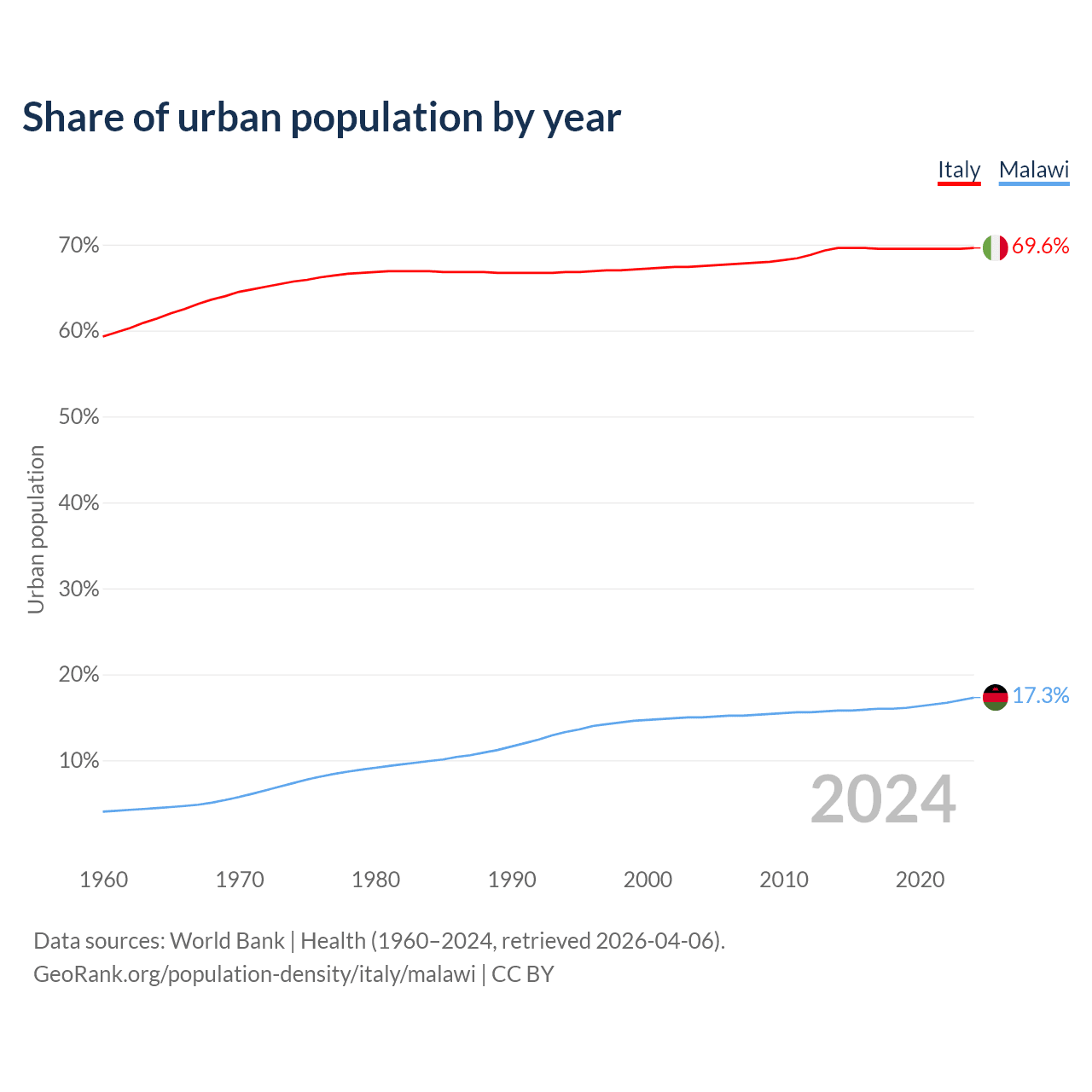 From 2004 to 2024, the share of urban population changed from 67.5% to 69.6% in Italy and from 15% to 17.3% in Malawi.