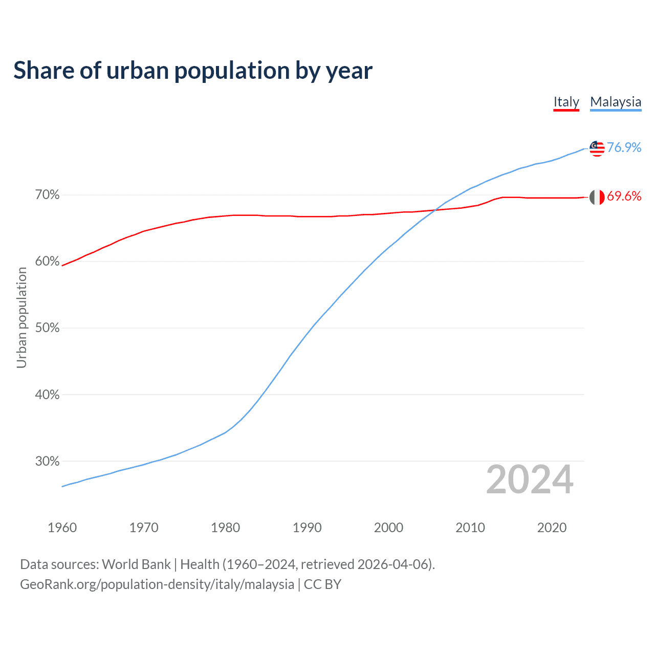 From 2004 to 2024, the share of urban population changed from 67.5% to 69.6% in Italy and from 66.1% to 76.9% in Malaysia.