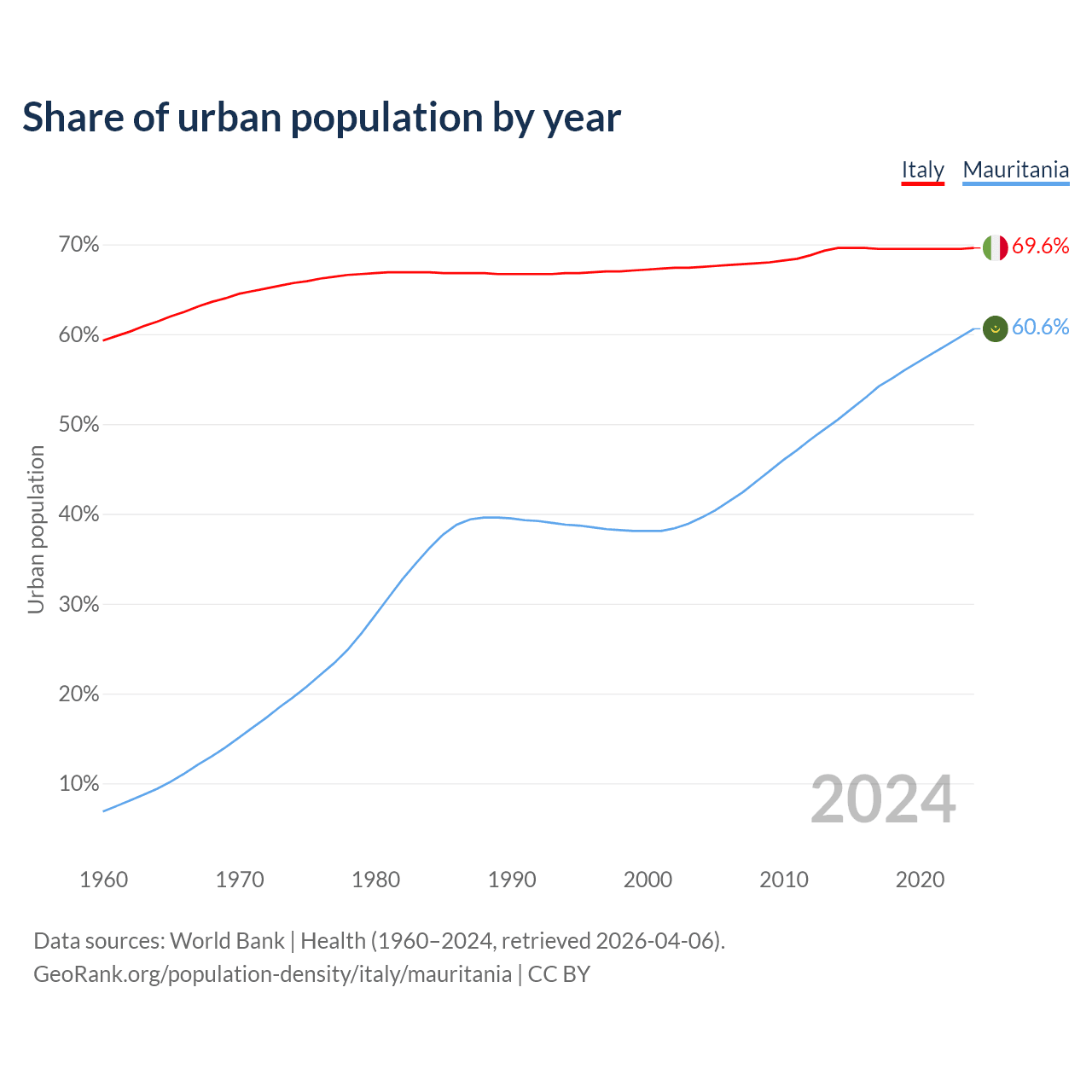 From 2004 to 2024, the share of urban population changed from 67.5% to 69.6% in Italy and from 39.6% to 60.6% in Mauritania.