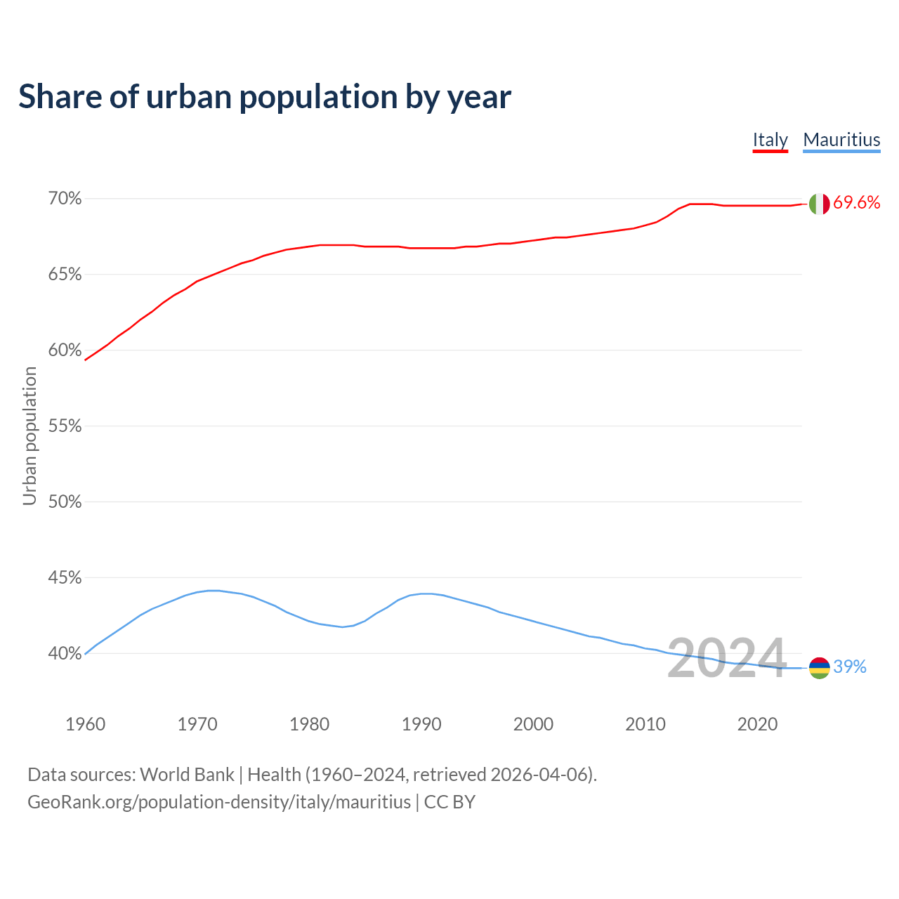 From 2004 to 2024, the share of urban population changed from 67.5% to 69.6% in Italy and from 41.3% to 39% in Mauritius.
