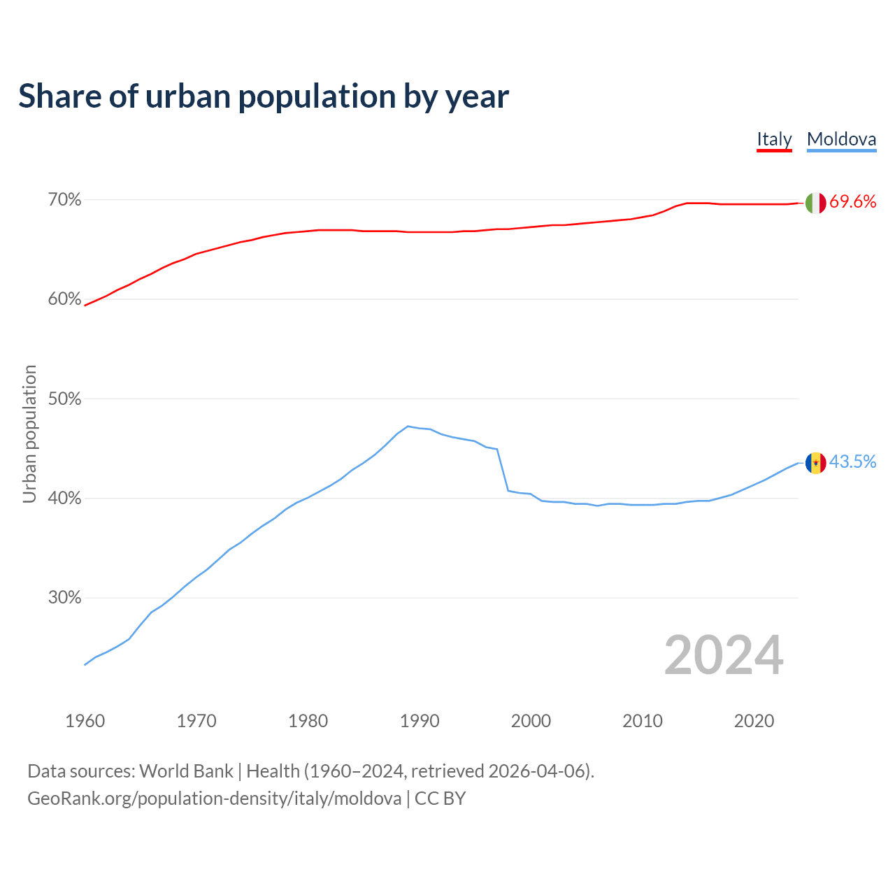 From 2004 to 2024, the share of urban population changed from 67.5% to 69.6% in Italy and from 39.4% to 43.5% in Moldova.