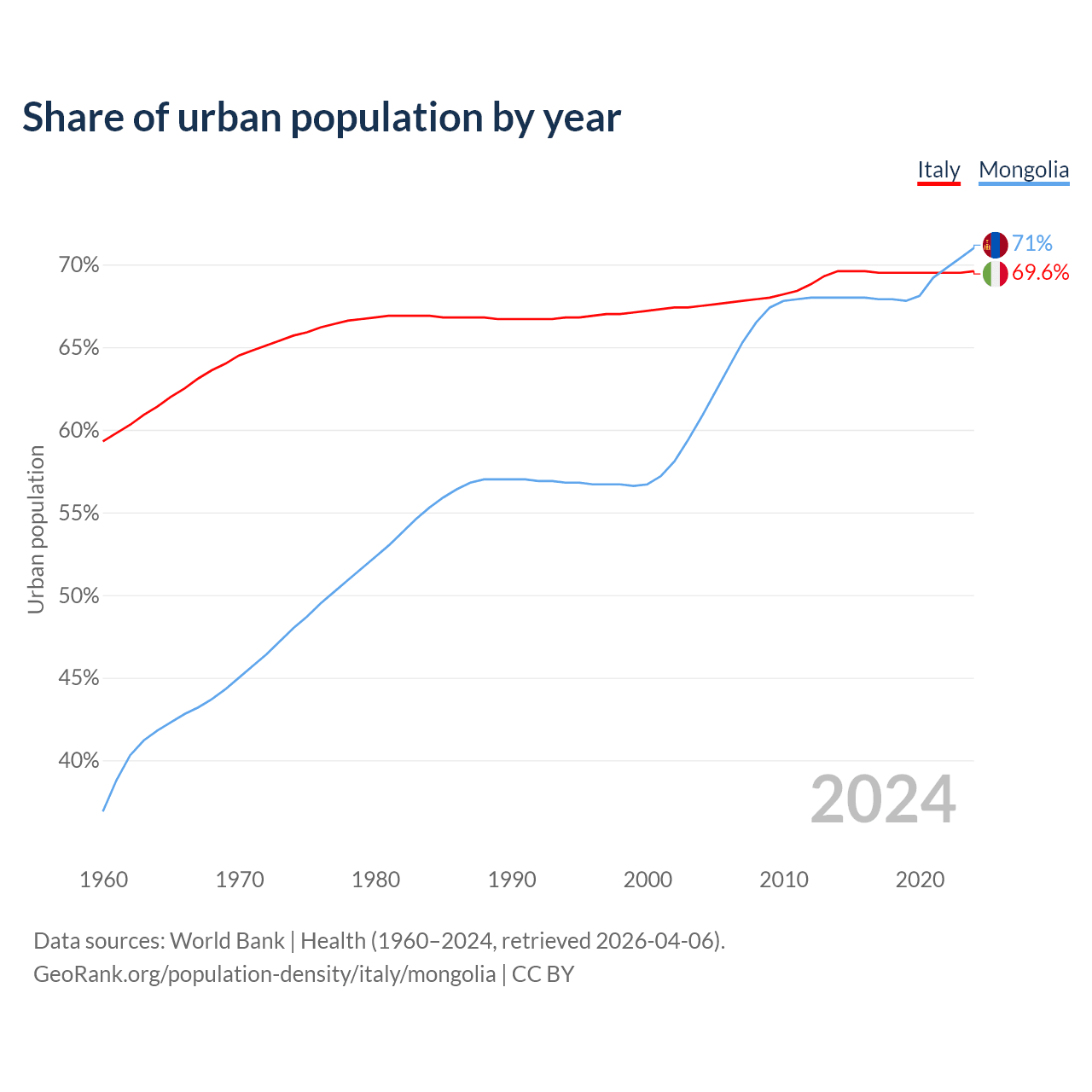From 2004 to 2024, the share of urban population changed from 67.5% to 69.6% in Italy and from 60.8% to 71% in Mongolia.