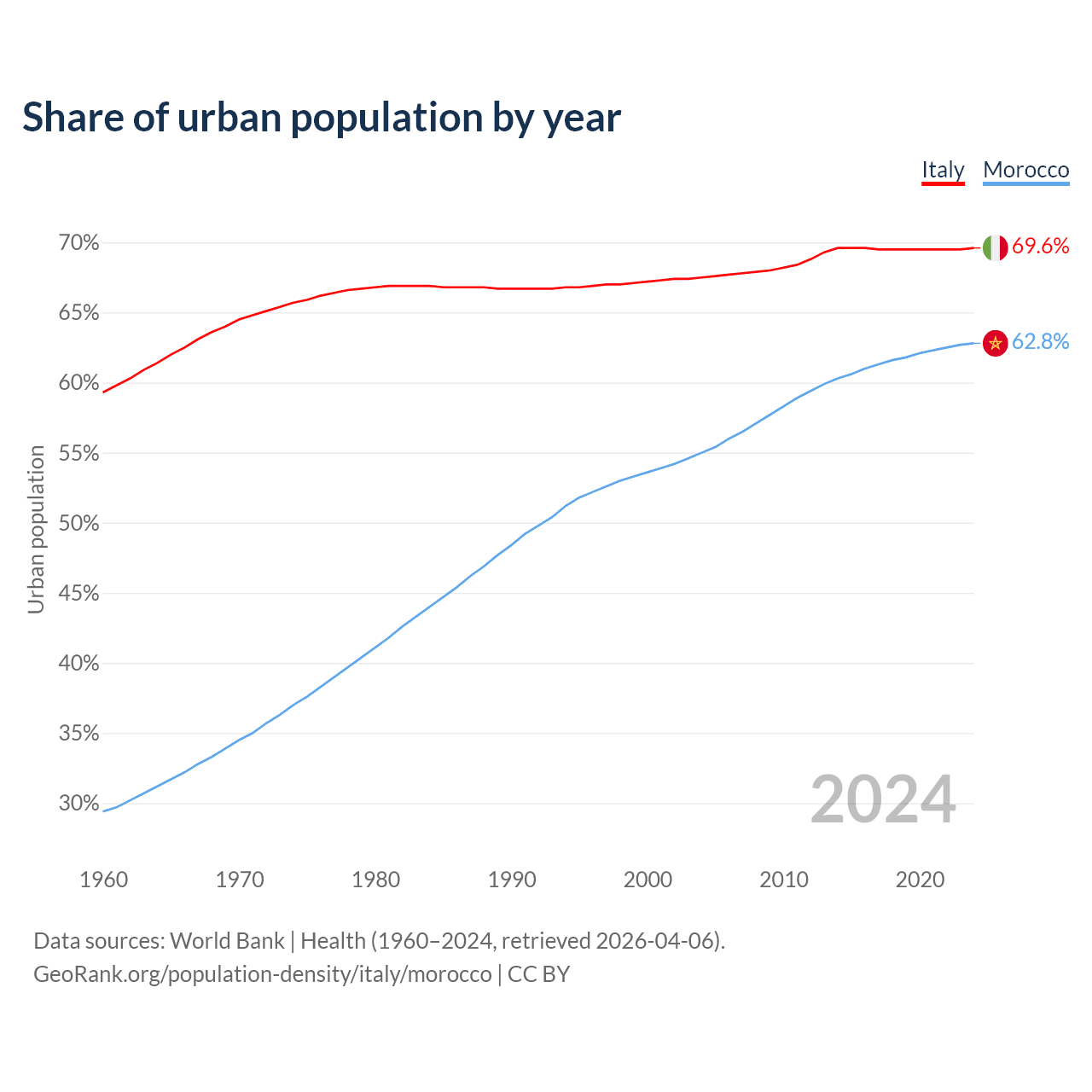 From 2004 to 2024, the share of urban population changed from 67.5% to 69.6% in Italy and from 55% to 62.8% in Morocco.
