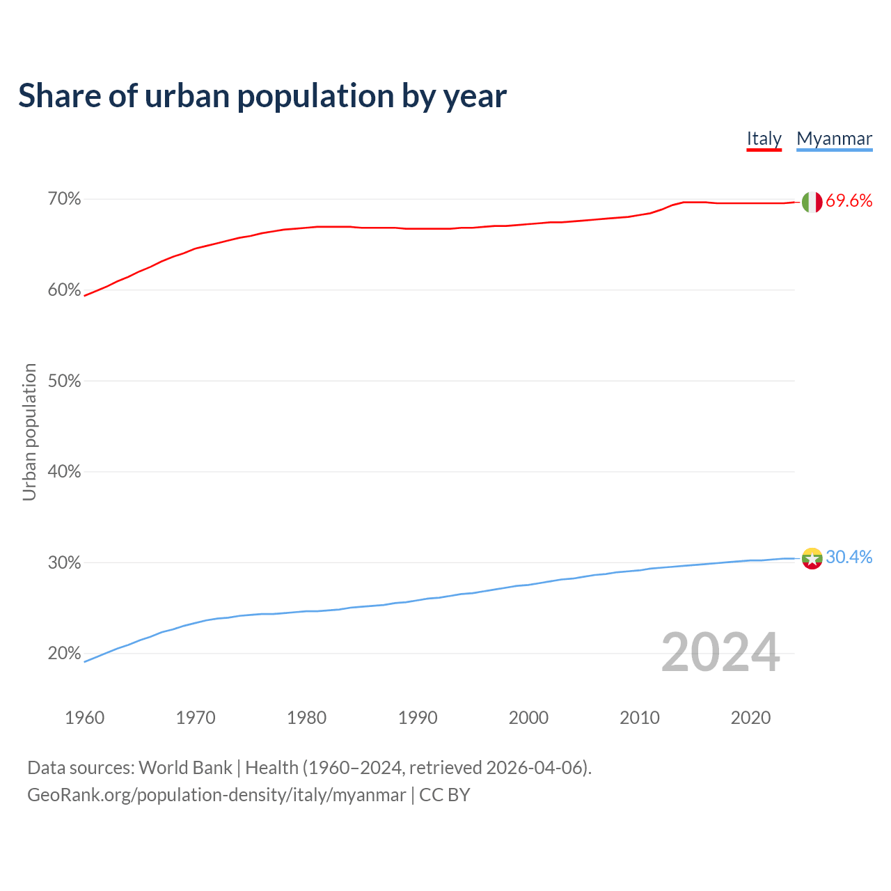 From 2004 to 2024, the share of urban population changed from 67.5% to 69.6% in Italy and from 28.2% to 30.4% in Myanmar.