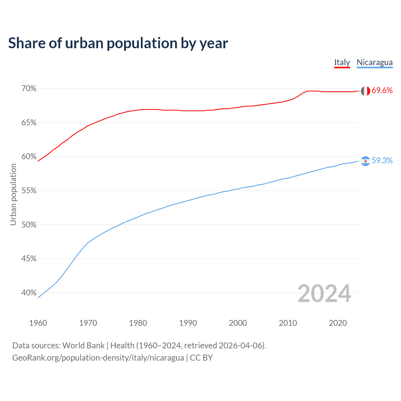 From 2004 to 2024, the share of urban population changed from 67.5% to 69.6% in Italy and from 55.8% to 59.3% in Nicaragua.