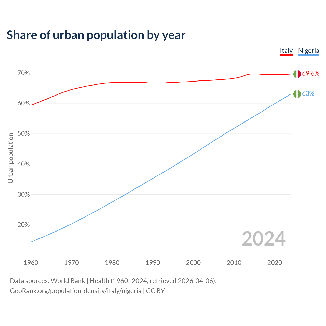 From 2004 to 2024, the share of urban population changed from 67.5% to 69.6% in Italy and from 46.7% to 63% in Nigeria.