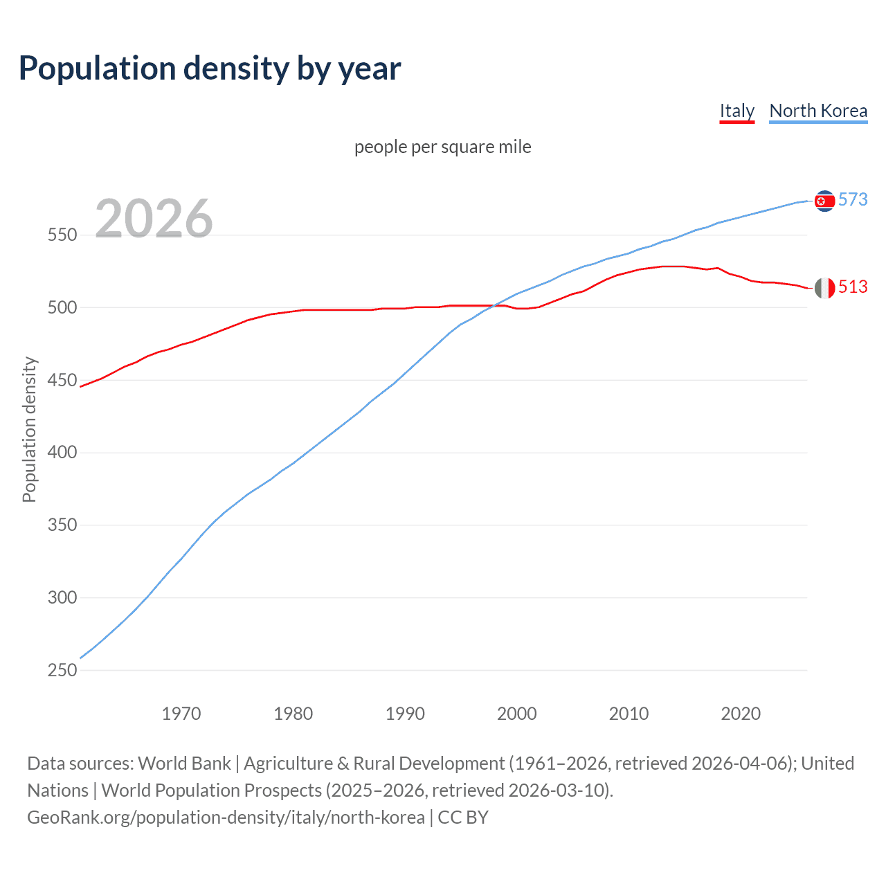 From 2006 to 2026, population density in Italy increased by 0.28%, compared to a 8.64% growth in North Korea.