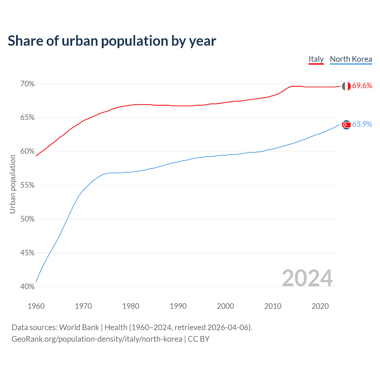 From 2004 to 2024, the share of urban population changed from 67.5% to 69.6% in Italy and from 59.7% to 63.9% in North Korea.
