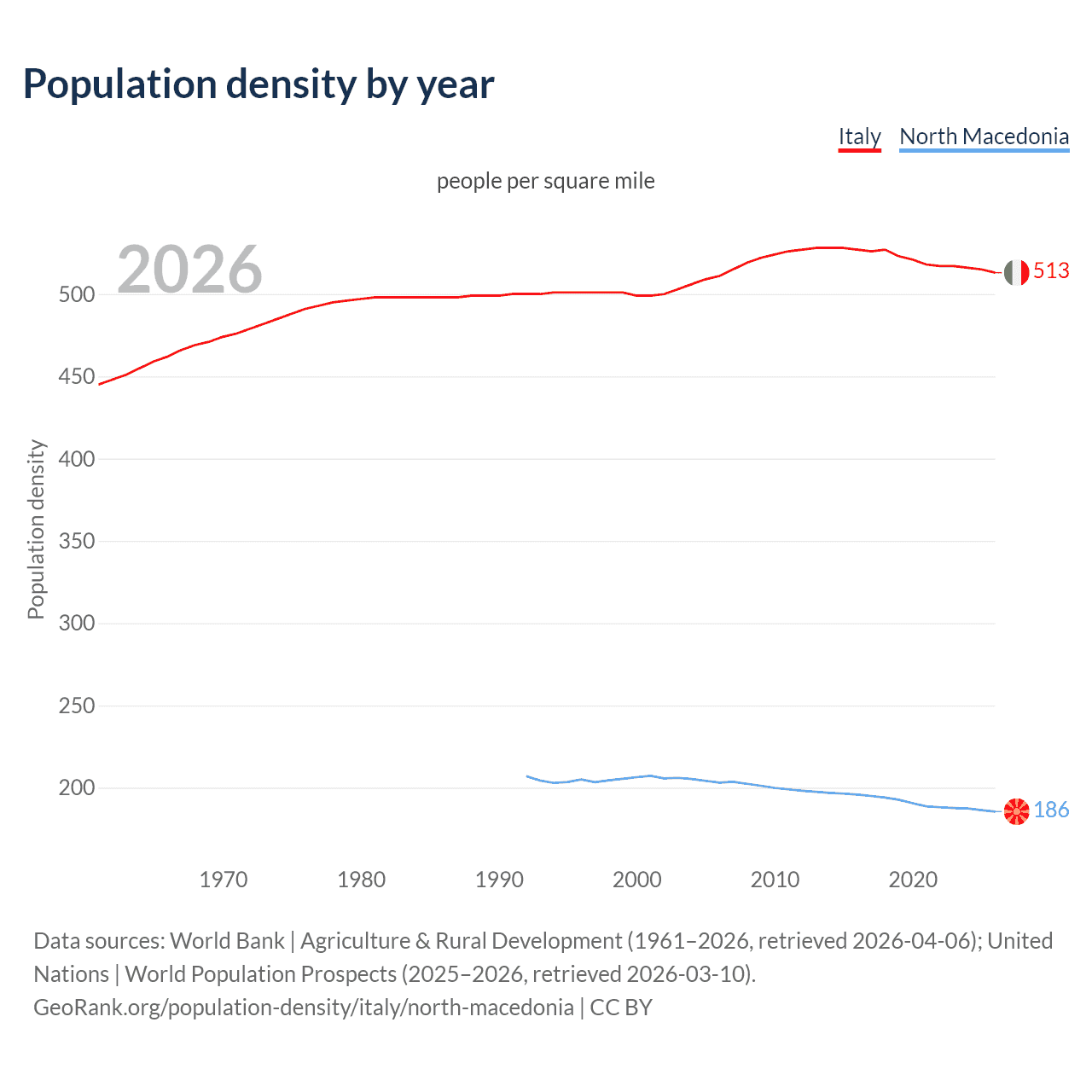 From 2006 to 2026, population density in Italy increased by 0.28%, compared to a 8.69% decline in North Macedonia.