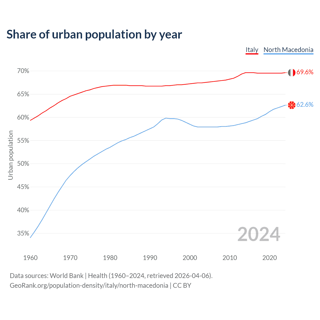 From 2004 to 2024, the share of urban population changed from 67.5% to 69.6% in Italy and from 57.9% to 62.6% in North Macedonia.