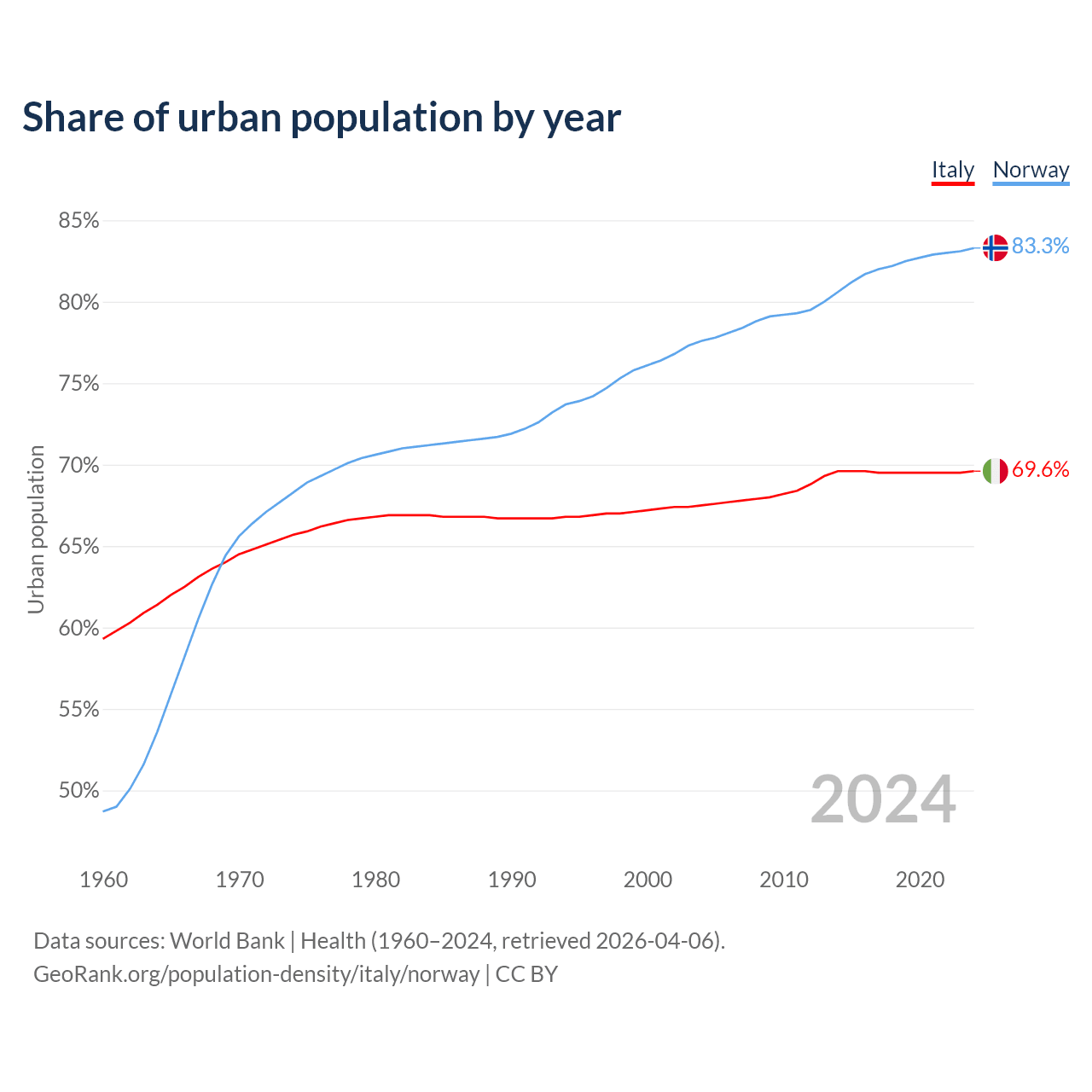 From 2004 to 2024, the share of urban population changed from 67.5% to 69.6% in Italy and from 77.6% to 83.3% in Norway.