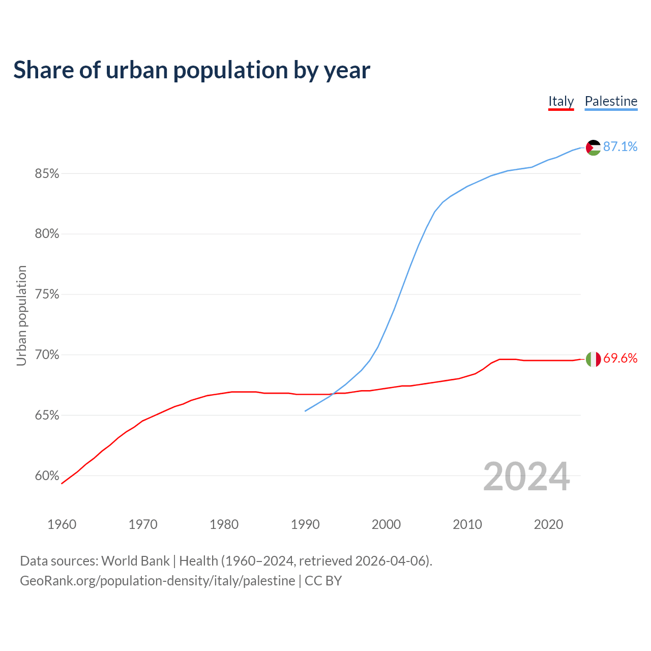 From 2004 to 2024, the share of urban population changed from 67.5% to 69.6% in Italy and from 79% to 87.1% in Palestine.