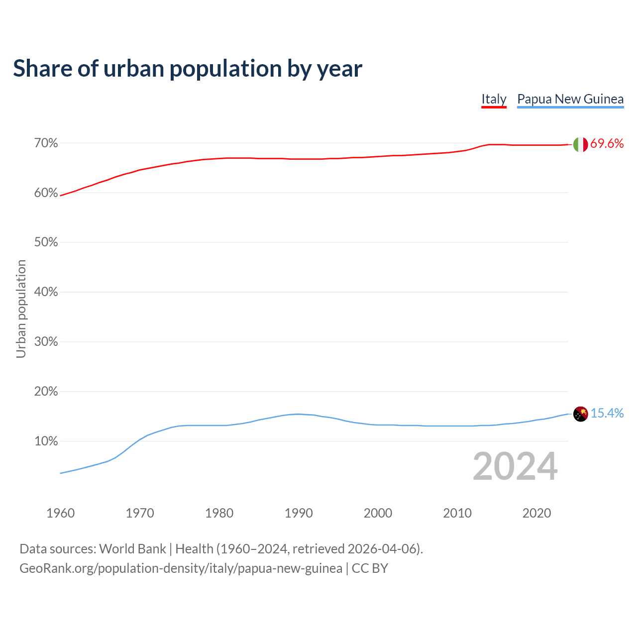 From 2004 to 2024, the share of urban population changed from 67.5% to 69.6% in Italy and from 13.1% to 15.4% in Papua New Guinea.