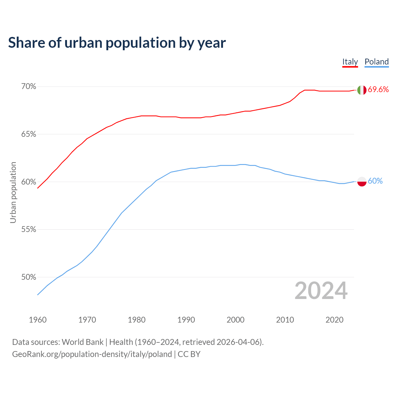 From 2004 to 2024, the share of urban population changed from 67.5% to 69.6% in Italy and from 61.7% to 60% in Poland.