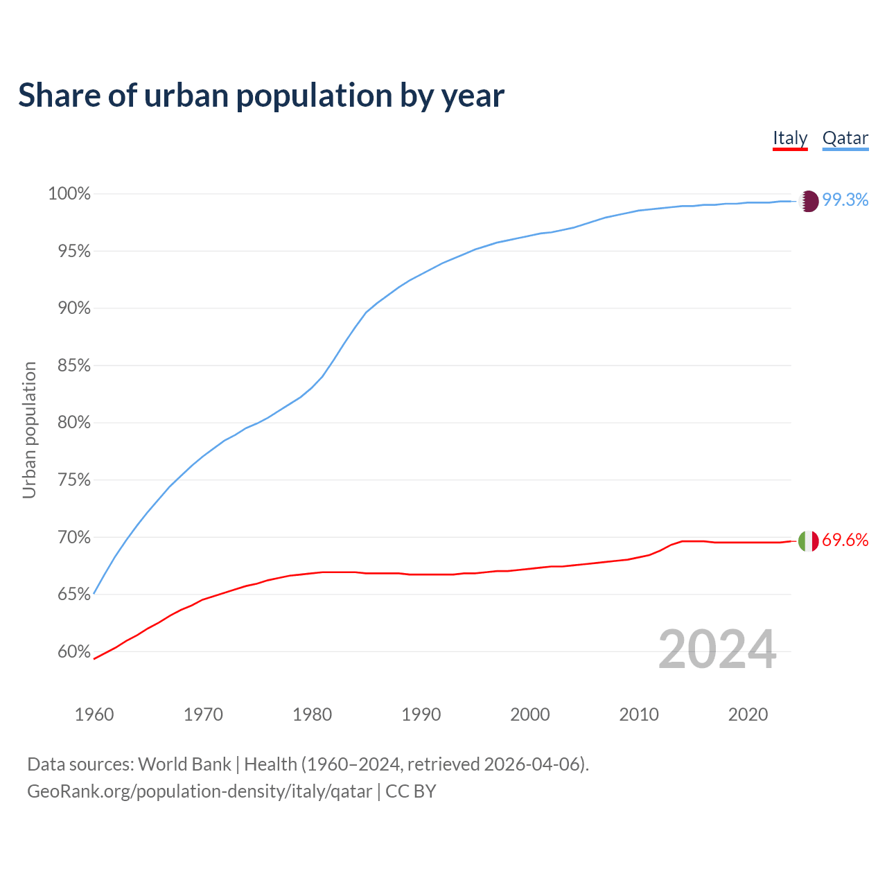 From 2004 to 2024, the share of urban population changed from 67.5% to 69.6% in Italy and from 97% to 99.3% in Qatar.