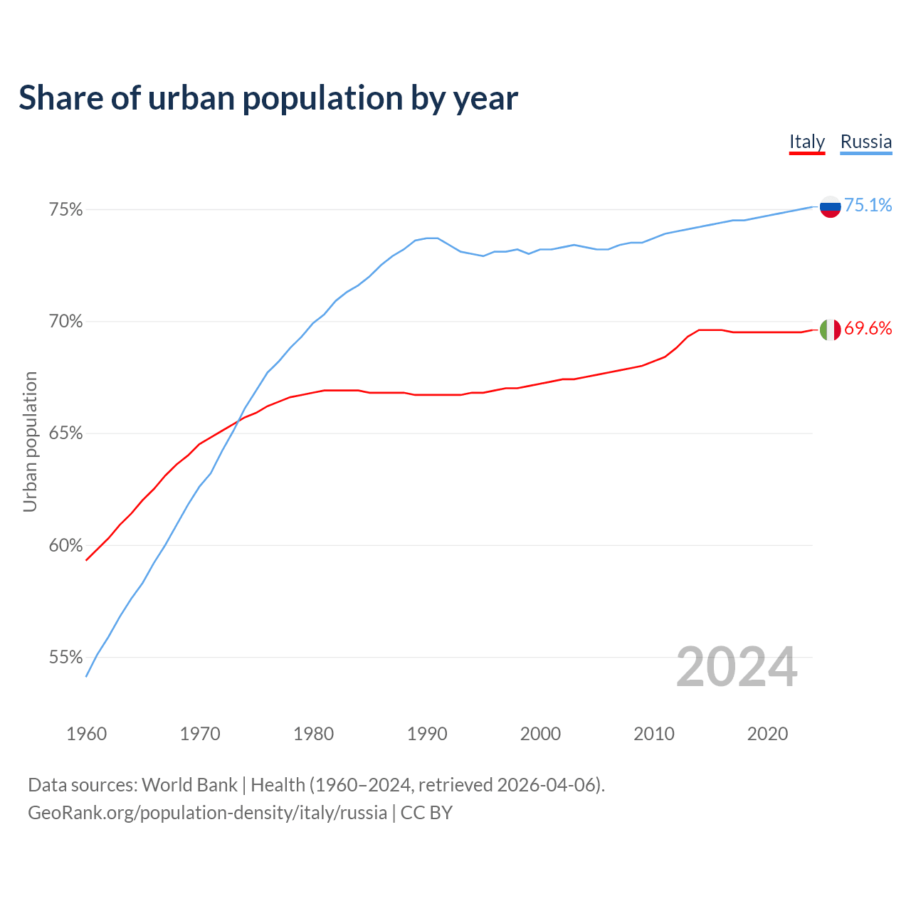 From 2004 to 2024, the share of urban population changed from 67.5% to 69.6% in Italy and from 73.3% to 75.1% in Russia.