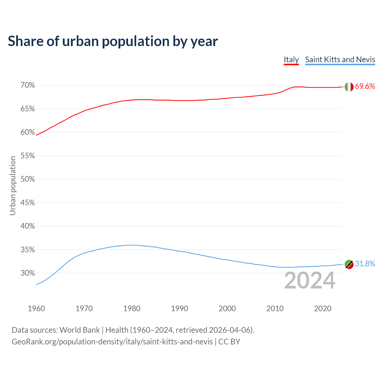 From 2004 to 2024, the share of urban population changed from 67.5% to 69.6% in Italy and from 32.1% to 31.8% in Saint Kitts and Nevis.