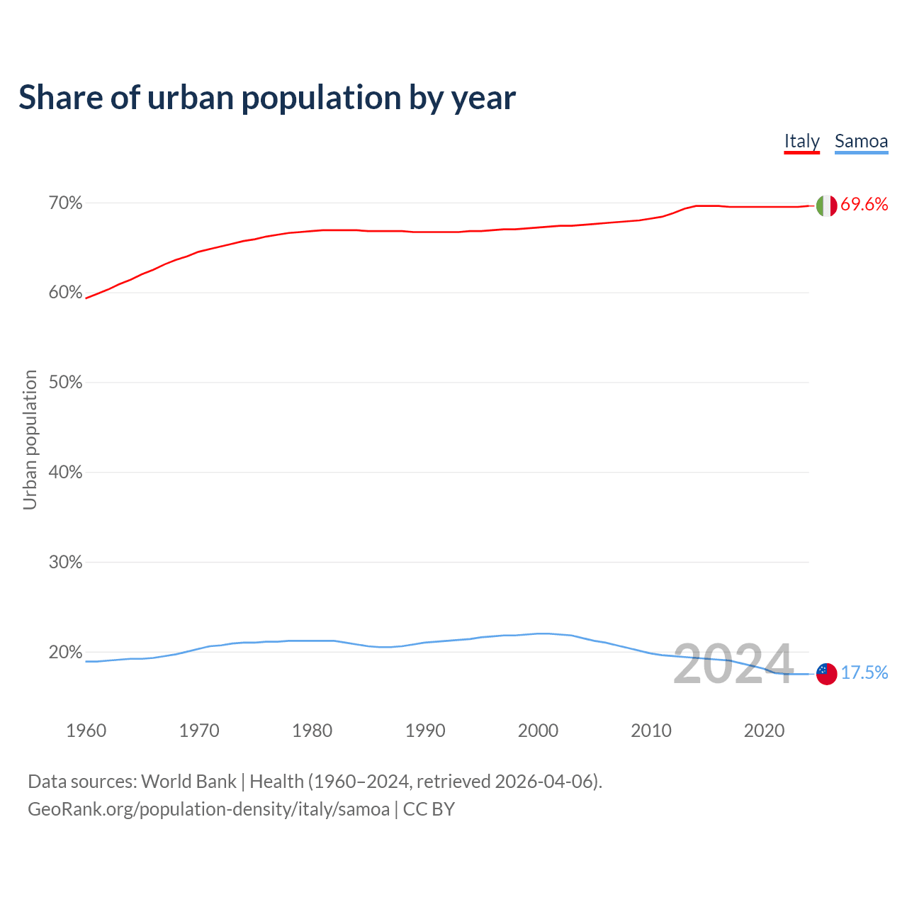 From 2004 to 2024, the share of urban population changed from 67.5% to 69.6% in Italy and from 21.5% to 17.5% in Samoa.