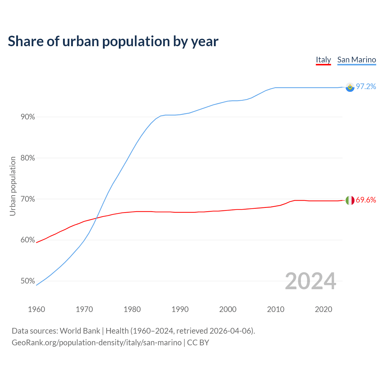 From 2004 to 2024, the share of urban population changed from 67.5% to 69.6% in Italy and from 94.2% to 97.2% in San Marino.